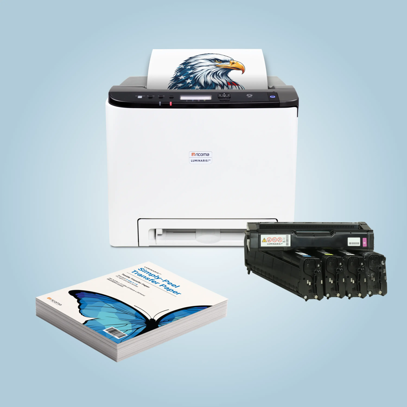 The Luminaris 200 is a versatile and user-friendly white toner transfer printer designed to bring vibrant, full-color designs to a wide range of materials. Perfect for printing on shirts, bags, mugs, ceramics, leather, glass, wood, and more, this printer offers excellent performance without the mess of traditional inks.